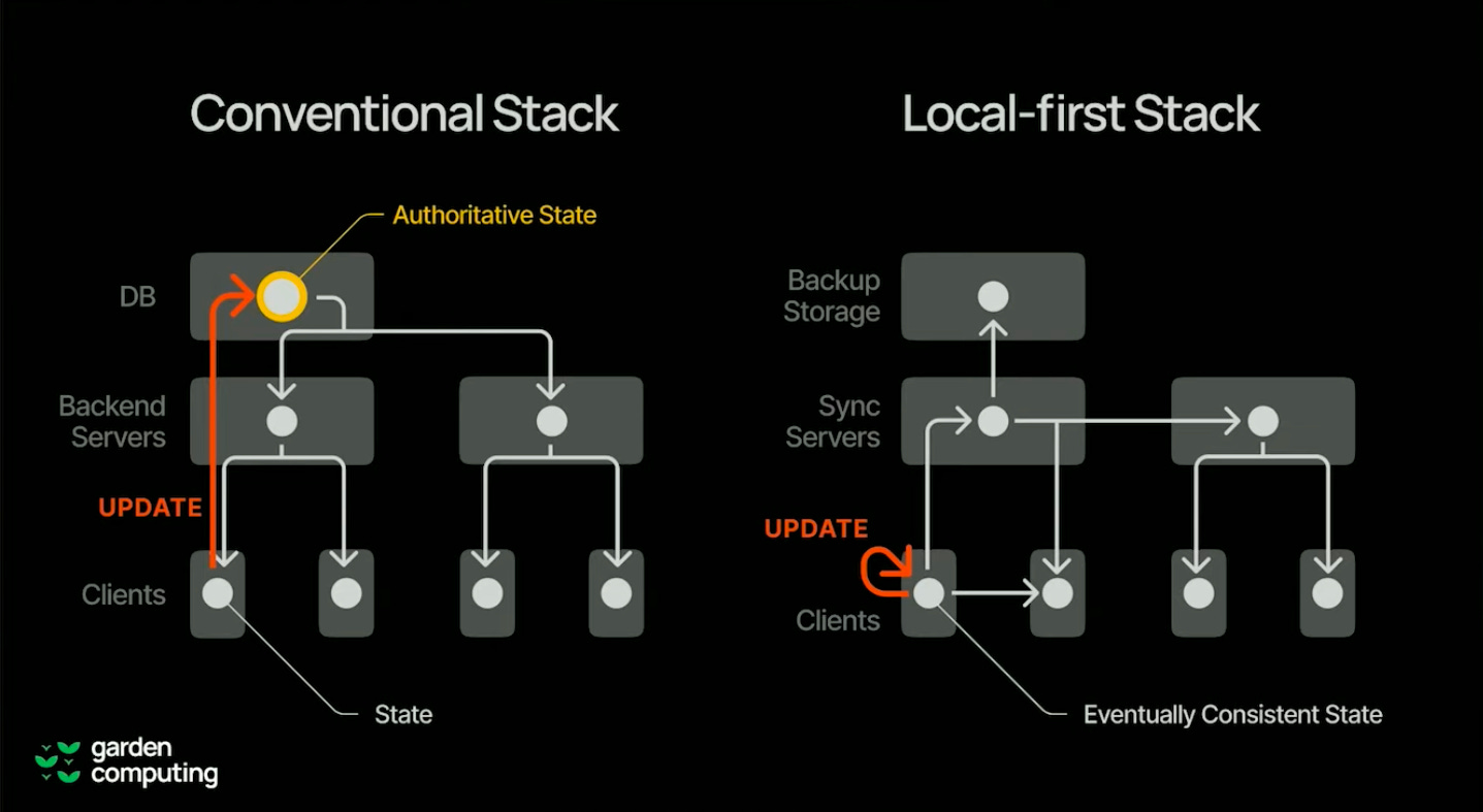 Em vez dos dados ficarem centralizados em um servidor, cada cliente (navegador, app móvel) mantém uma cópia local completa dos dados. O servidor passa a ter um papel secundário: ajudar na sincronização entre diferentes dispositivos.