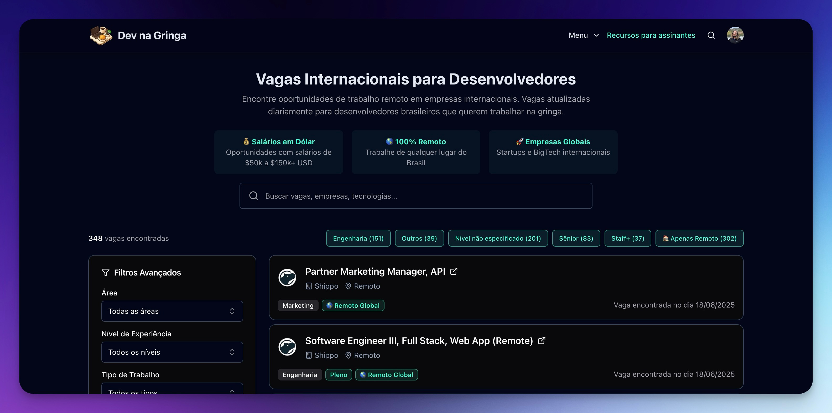 Hoje temos 348 vagas atualizadas diariamente, todas filtradas pra brasileiros. Acesse em nagringa.dev/vagas - não-assinantes veem 3 vagas, assinantes têm acesso completo.