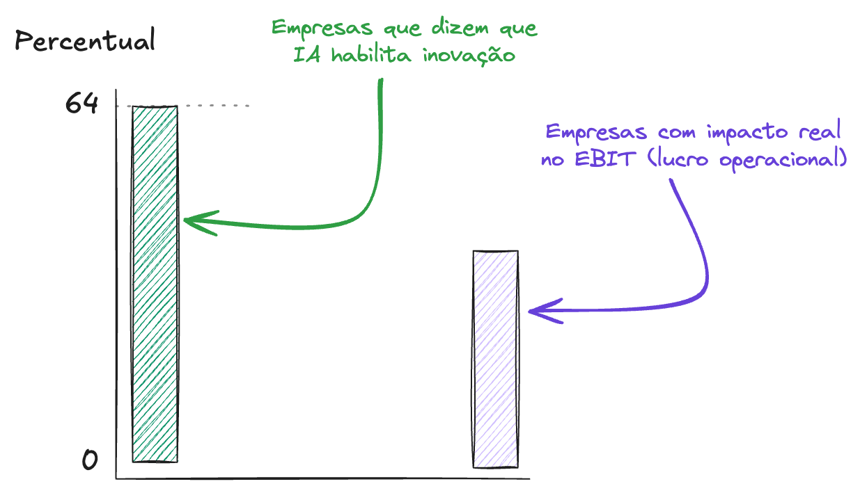Dados da McKinsey mostram o gap: 64% das empresas dizem que IA habilita inovação. Mas apenas 39% reportam impacto real no EBIT (lucro operacional).