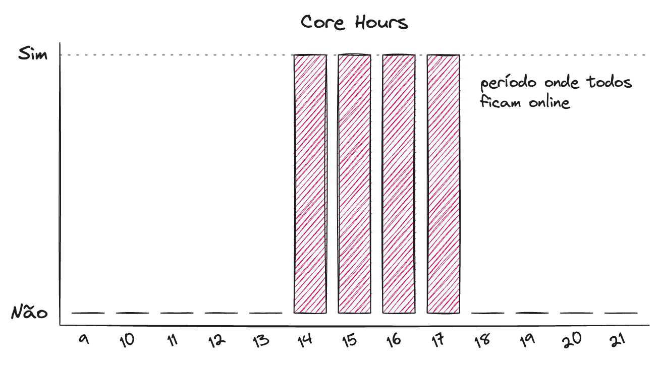 Apesar do horário ser flexível, todas as equipes em que trabalhei têm um conceito de core hours. É um período fixo no dia onde todos do time tentam ficar online. Costuma ser ajustado ao fuso horário da maioria da equipe ou do fundador.