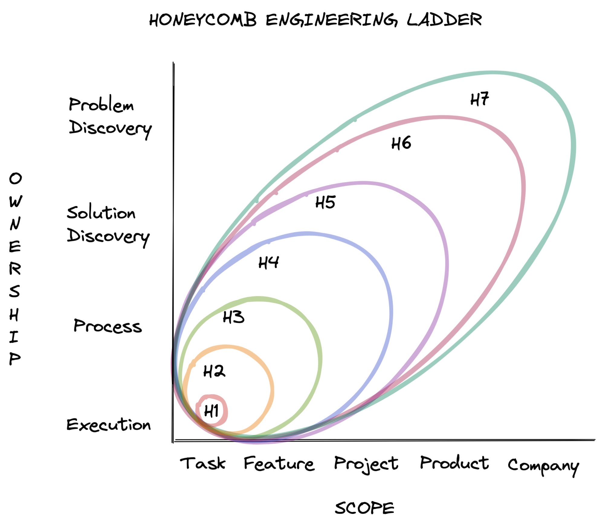 Um engenheiro sênior é o nível H5. Podemos ver que, conforme você cresce na carreira, você acaba sendo responsável por novas áreas. E, o escopo de onde você trabalha também cresce.