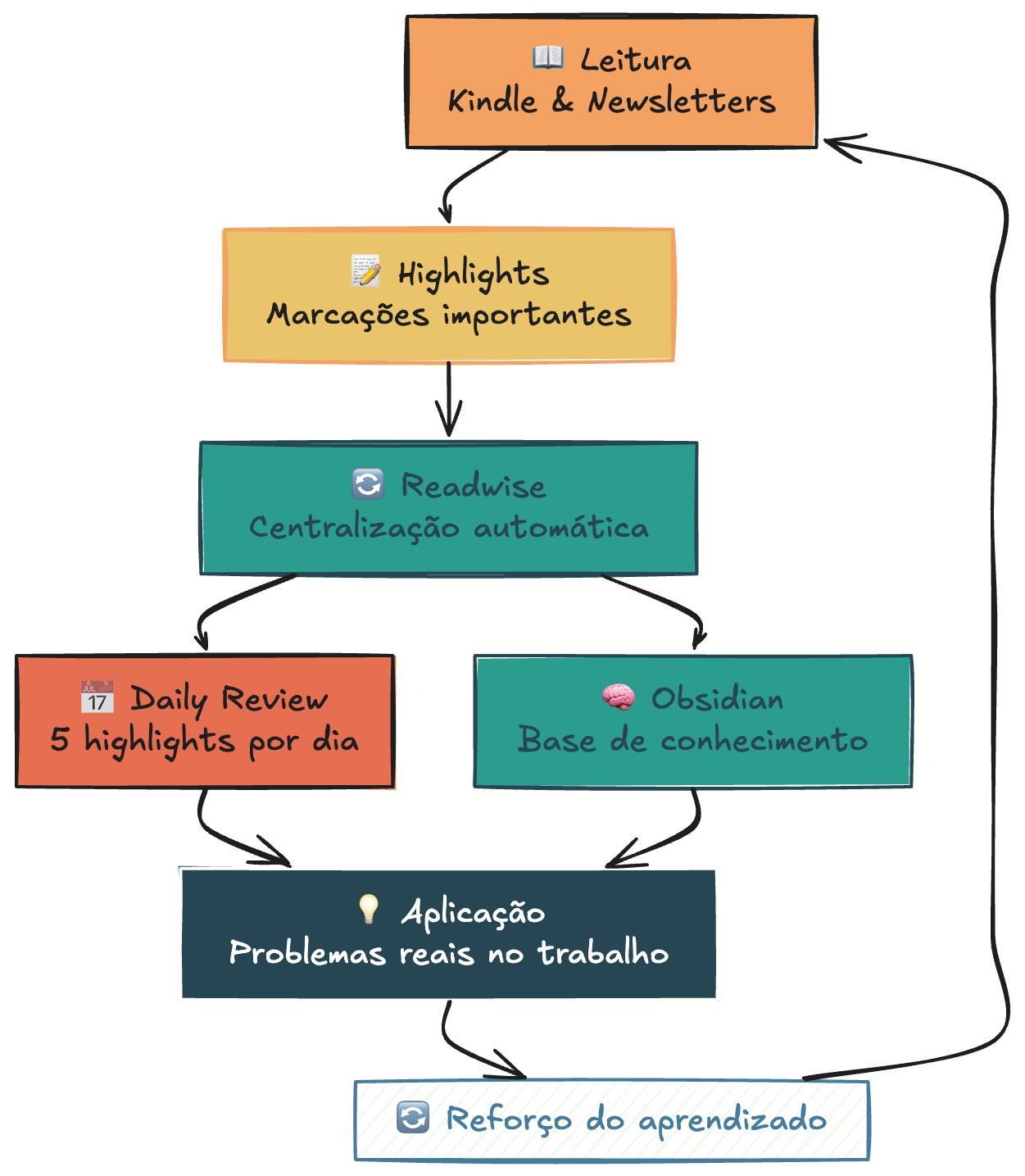 Obsidian é onde tudo se conecta. O Readwise sincroniza todos meus highlights pra lá automaticamente, organizados por livro/artigo.